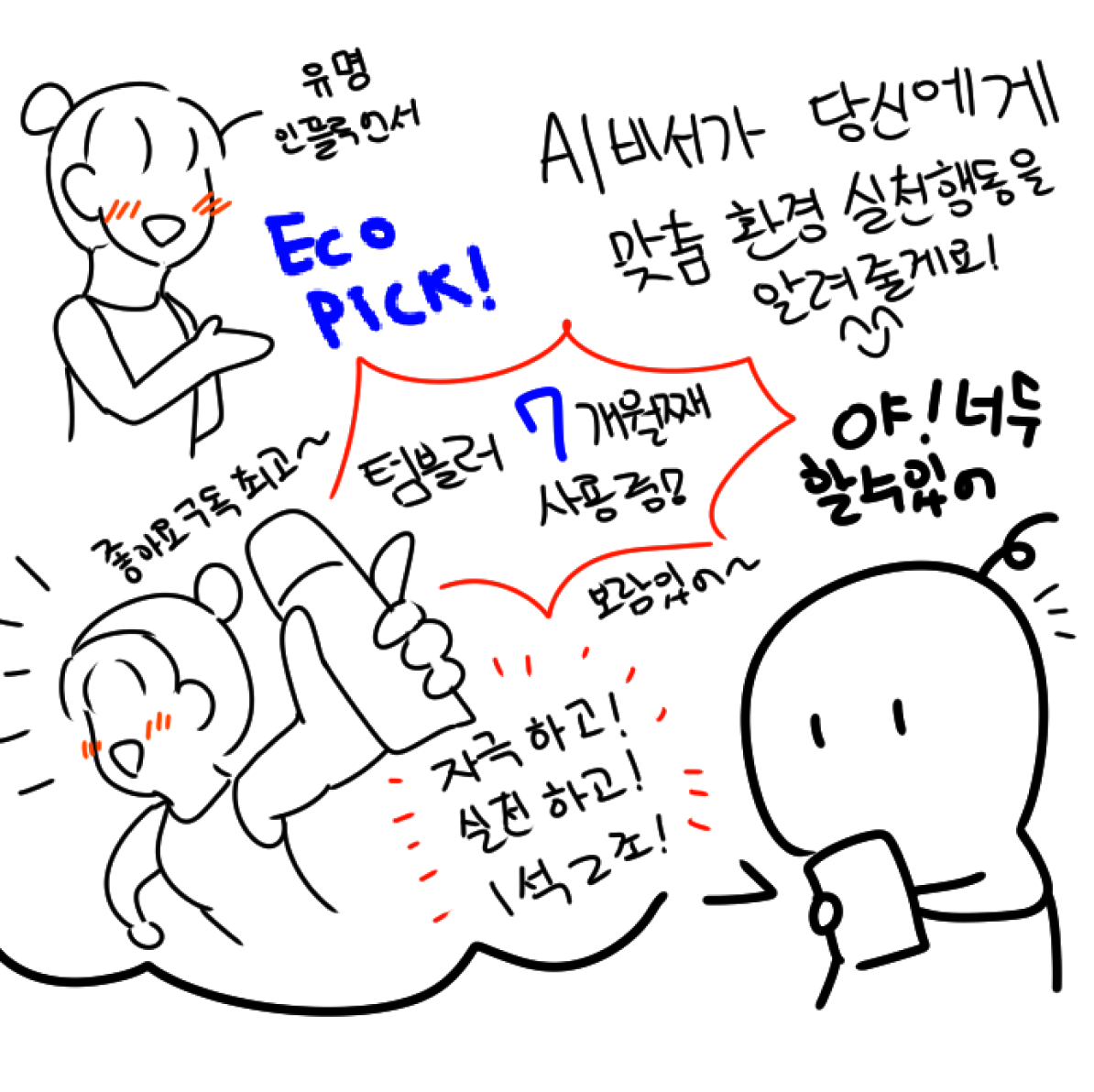 평소처럼 인스타그램에서 릴스를 넘겨보다 인플루언서가 찍은 에코픽 광고 릴스를 보게 된다. AI비서가 추천해주는 환경 보호 행동을 실천하고 즐겁게 환경 컨텐츠를 접하는 모습을 보면서 ‘에코픽’에 관심이 생겼다. - 행동: