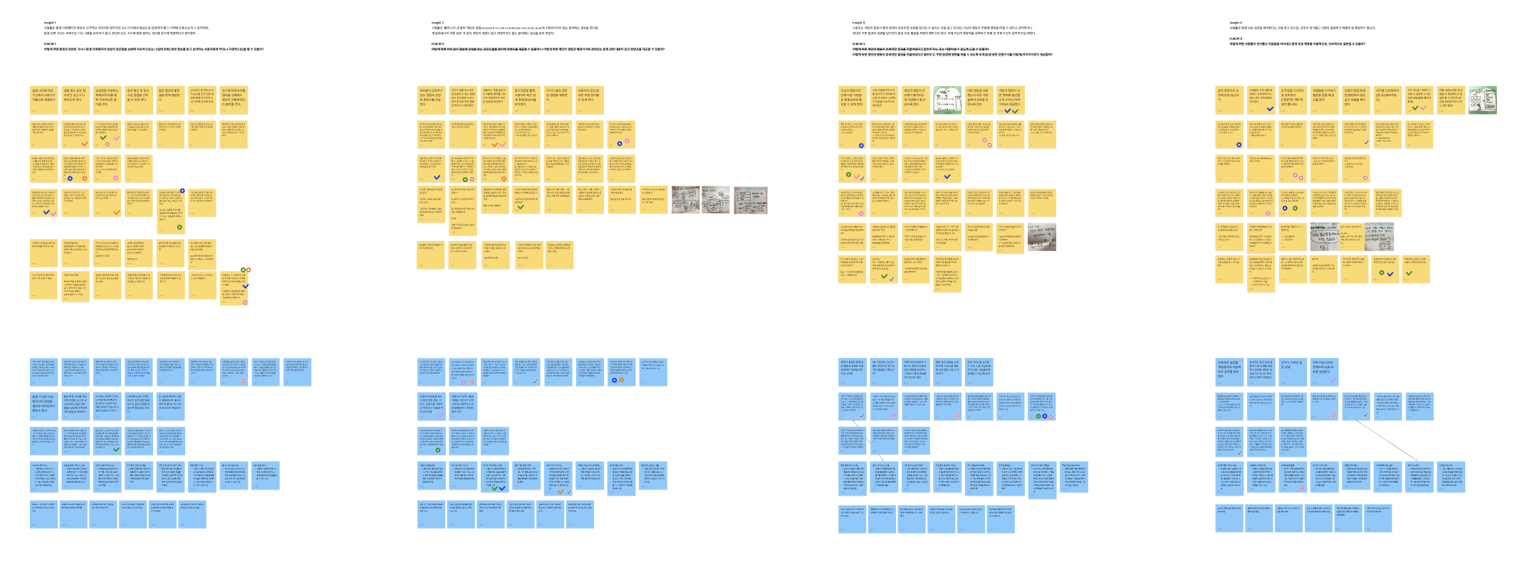 지난주에 뽑은 4가지 인사이트(1가지 주제당 1개의 인사이트)를 바탕으로 각각 4가지 How Might We(HMW) 질문을 작성했다.